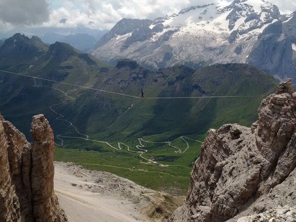 Subito dopo il periodo agonistico, tramite una cerchia di amici, mi sono appassionato alla slackline, che già praticavo da qualche anno ma in maniera scherzosa diciamo. Mio papà (figura di riferimento per me in qualsiasi attività sportiva) ne aveva montata una in giardino. Inizialmente solo per gioco ci sfidavamo a starci in piedi sopra. All’inizio era più bravo lui, ma una prova oggi e una domani ho imparato a camminarci su quella fettuccia. Allora non sapevo ancora che, negli anni successivi, quella fettuccia mi avrebbe regalato emozioni indimenticabili, esperienze teatrali, spettacoli circensi e attraversate da una cima all’altra della montagna in posti mozzafiato con 600 metri di vuoto sotto. È un’attività che mi ha riempito molto, é accessibile praticamente a chiunque e penso sia propedeutica a molti sport. Per quanto mi riguarda penso che se riesco ad avere un buon equilibrio in arrampicata è grazie alla slackline e forse faccio highline perchè so arrampicare.